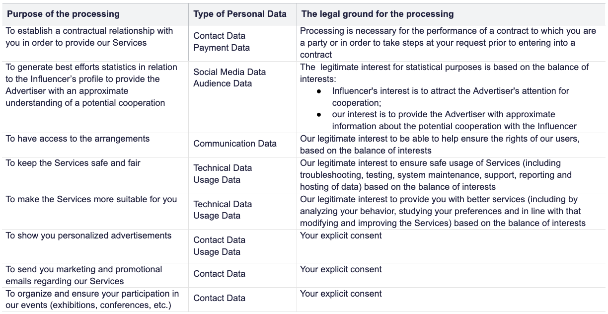 Since we process a big amount of data, we are not able to notify every Influencer and its audience about such processing but we assume that notification about such processing follows from this Privacy Policy. Such processing is based on our legitimate interest as described in the section “How do we use your Personal Data” and does not affect the rights and freedoms of the Influencer and its audience as natural persons.